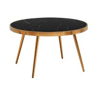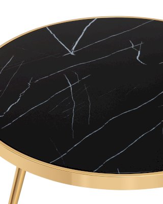 Столешница выполнена из закаленного стекла, которое обладает повышенной прочностью и стойкостью к перепадам температур, способно выдерживать большие нагрузки. Поверхность столешницы декорирована рисунком черного мрамора, который идеально сочетается со стальными ножками в золотом цвете.