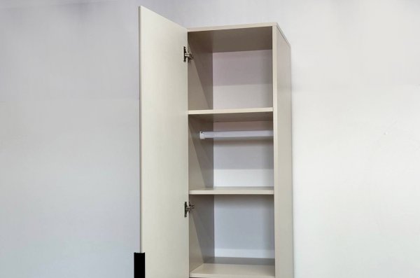 Особое внимание заслуживает фрезеровка фасада, которая придаёт шкафу изысканный вид. Длинная пластиковая ручка гармонично дополняет общий стиль.