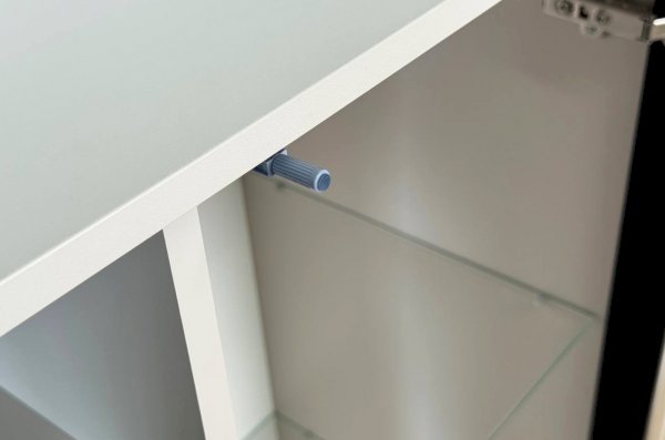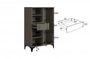 Дизайн комода продуман до мелочей: с одной стороны расположена стеклянная дверца, за которой находится просторное пространство для хранения. С другой стороны – ниша с открытой полкой, выкатной ящик и ещё одна глухая дверца, что позволяет гибко организовать хранение и поддерживать порядок в доме.