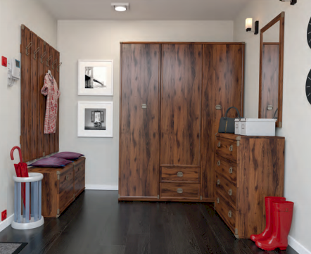 Оригинальный дизайн фасада, точно повторяющий текстуру отполированного дерева отлично впишется в современный интерьер. Дополняет общую композицию закругленные металлические края элементов мебели. В коллекцию Indiana входит большой ассортимент элементов мебели, который поможет создать интересный интерьер в комнате.