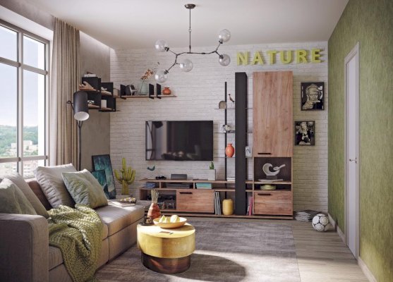 Изящный и стильный стеллаж с открытыми полками станет значимой интерьерной деталью гостиной. Комбинация стеклянных полок и элементов «под дерево» выглядит стильно и очень современно. Благодаря невидимым глазу креплениям создается впечатление, что стеклянные полки парят в воздухе. Но несмотря на кажущуюся легкость и воздушность, тонированное стекло выдерживает нагрузку до 5 кг, что позволит разместить на стеллаже комнатные растения или предметы декора. Регулируемые опоры слегка приподнимут стеллаж над полом, облегчая уборку, а также позволят компенсировать незначительные неровности пола.