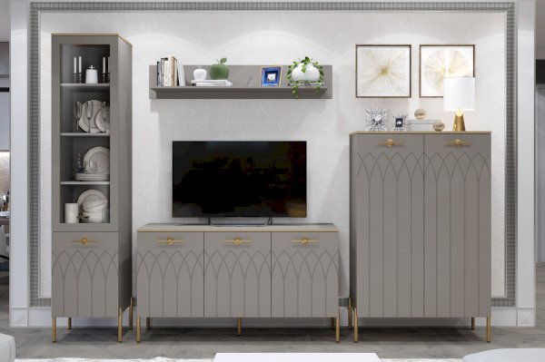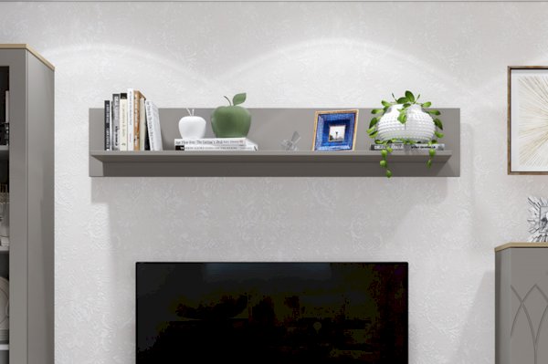 Интерьер современной гостиной должен быть не только красивым, но и функциональным. Для открытого хранения и расстановки предметов декора вы можете купить настенную навесную полку. Полка в мягком сером цвете мокко прекрасно впишется в интерьер в современном стиле.