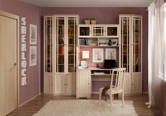 Благодаря модульности, библиотеку SHERLOCK можно расположить в Вашем домашнем кабинете, выбрав для компоновки именно те модули, которые Вам нужны. Письменный стол, расположенный у окна, сделает чтение и работу с документами максимально комфортным. В высоких изящных шкафах библиотеки SHERLOCK поместятся книги любого формата: от самых маленьких книг до больших иллюстрированных альбомов, поскольку Вы сами можете регулировать высоту полок. Тонированные стекла фасадов высоких книжных шкафов защитят книги от прямых солнечных лучей, пожелтения страниц, пыли и позволят без проблем найти нужную книгу.